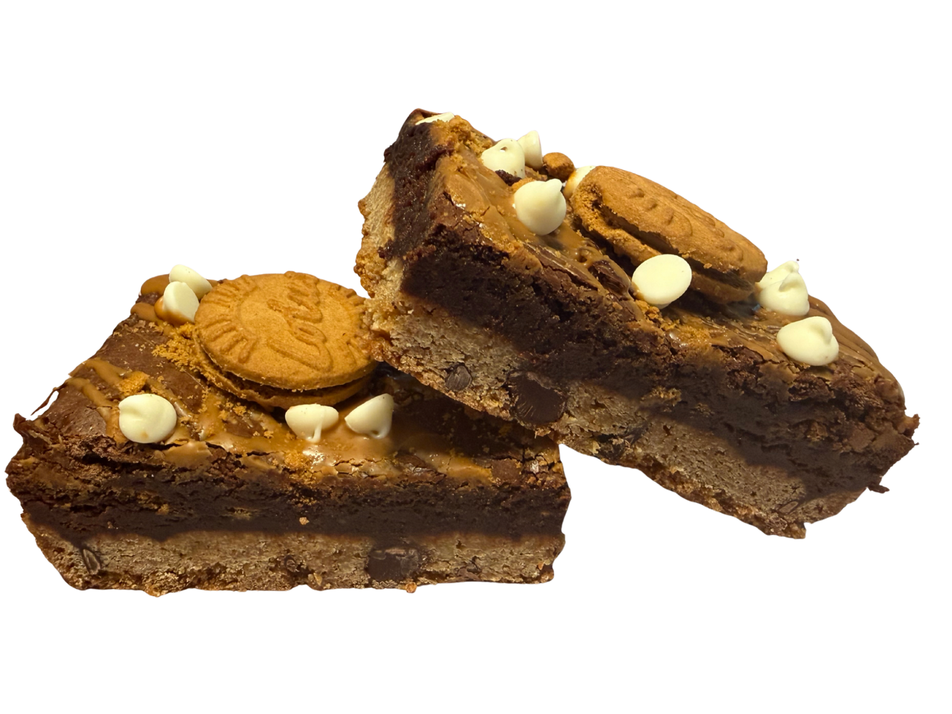 These brookies have the classic cookie and brownie layers combined with Biscoff spread. They are topped with white chocolate chips, even more Biscoff spread, and a Biscoff sandwich cookie!